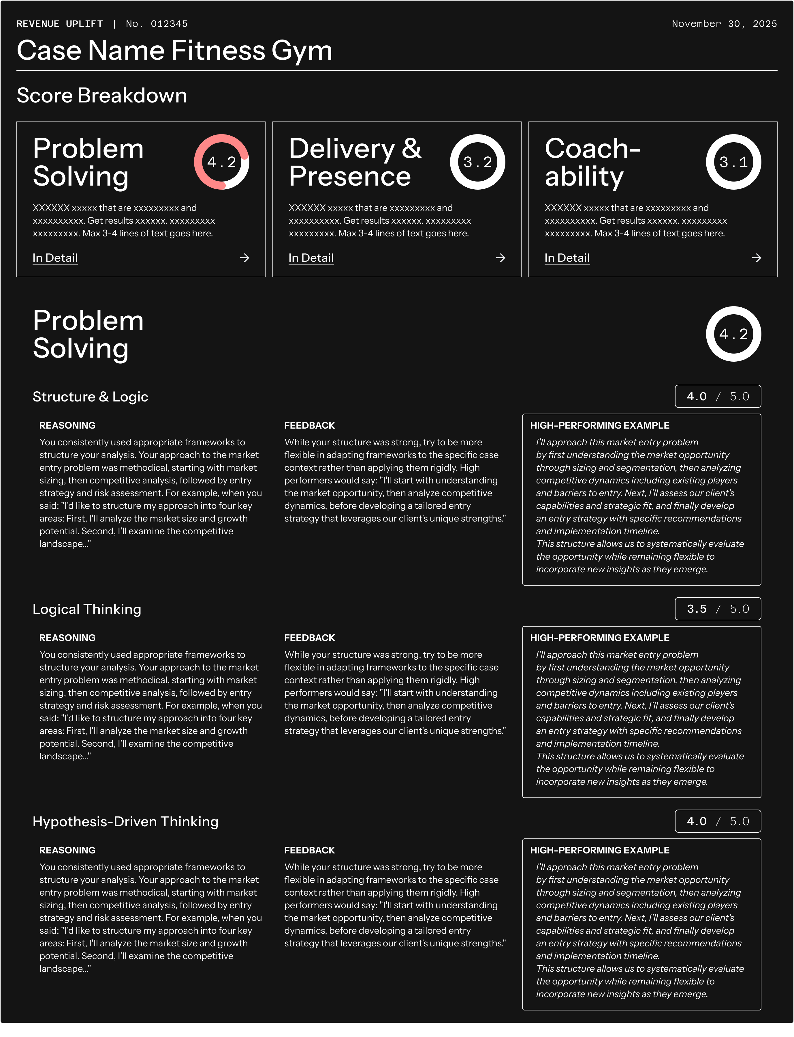 Problem Solving(問題解決力)、Delivery & Presence(伝達力)、Coachability(成長可能性)の3軸で評価。各軸をさらに細分化し、Structure & Logic・Logical Thinking・Hypothesis-Driven Thinkingなど項目ごとに5点満点でスコアリングします。