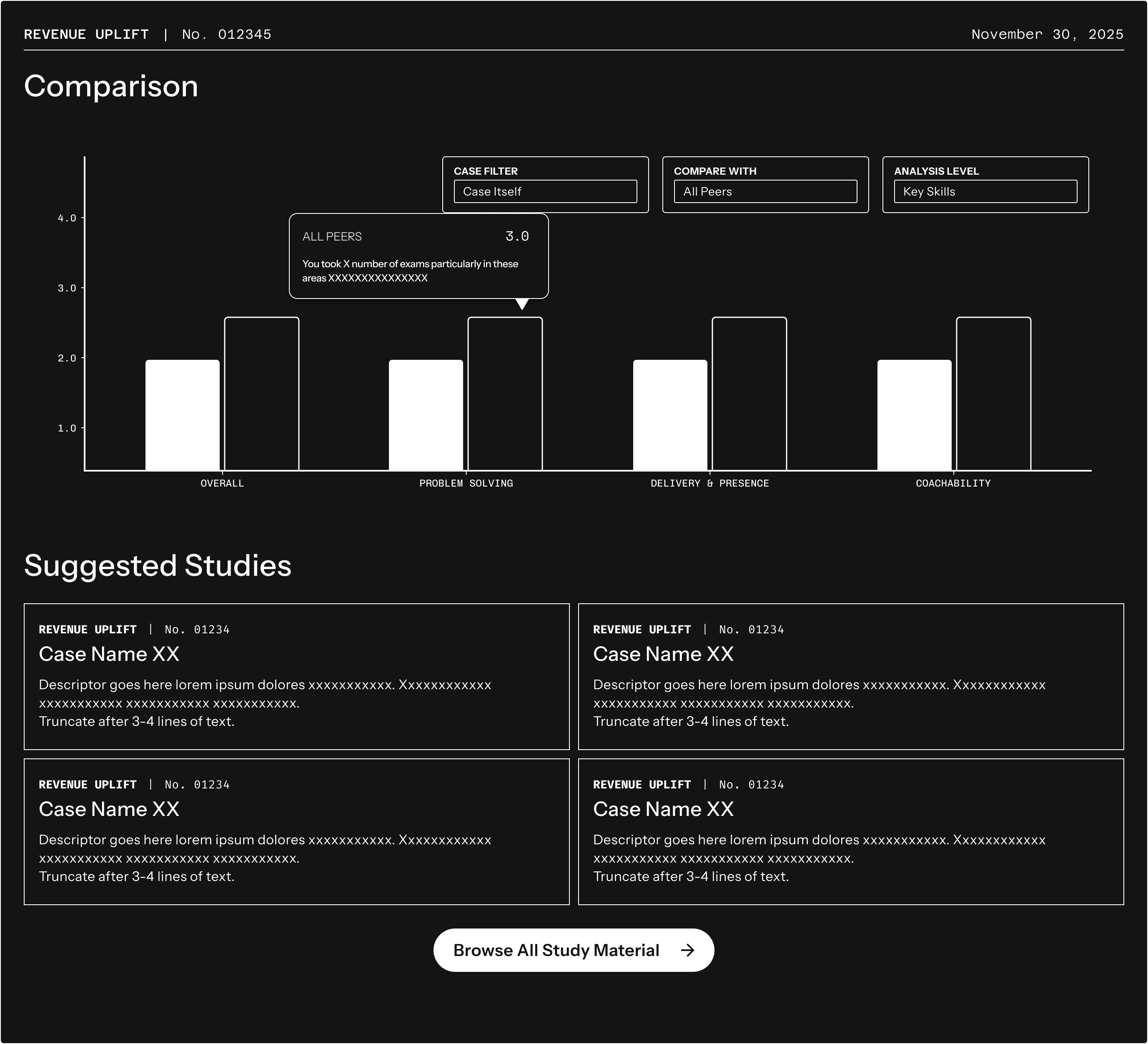 全受験者との比較チャートで、Overall・Problem Solving・Delivery & Presence・Coachabilityの各軸における自分の立ち位置を可視化。弱点に基づいた学習コンテンツも自動推奨されます。